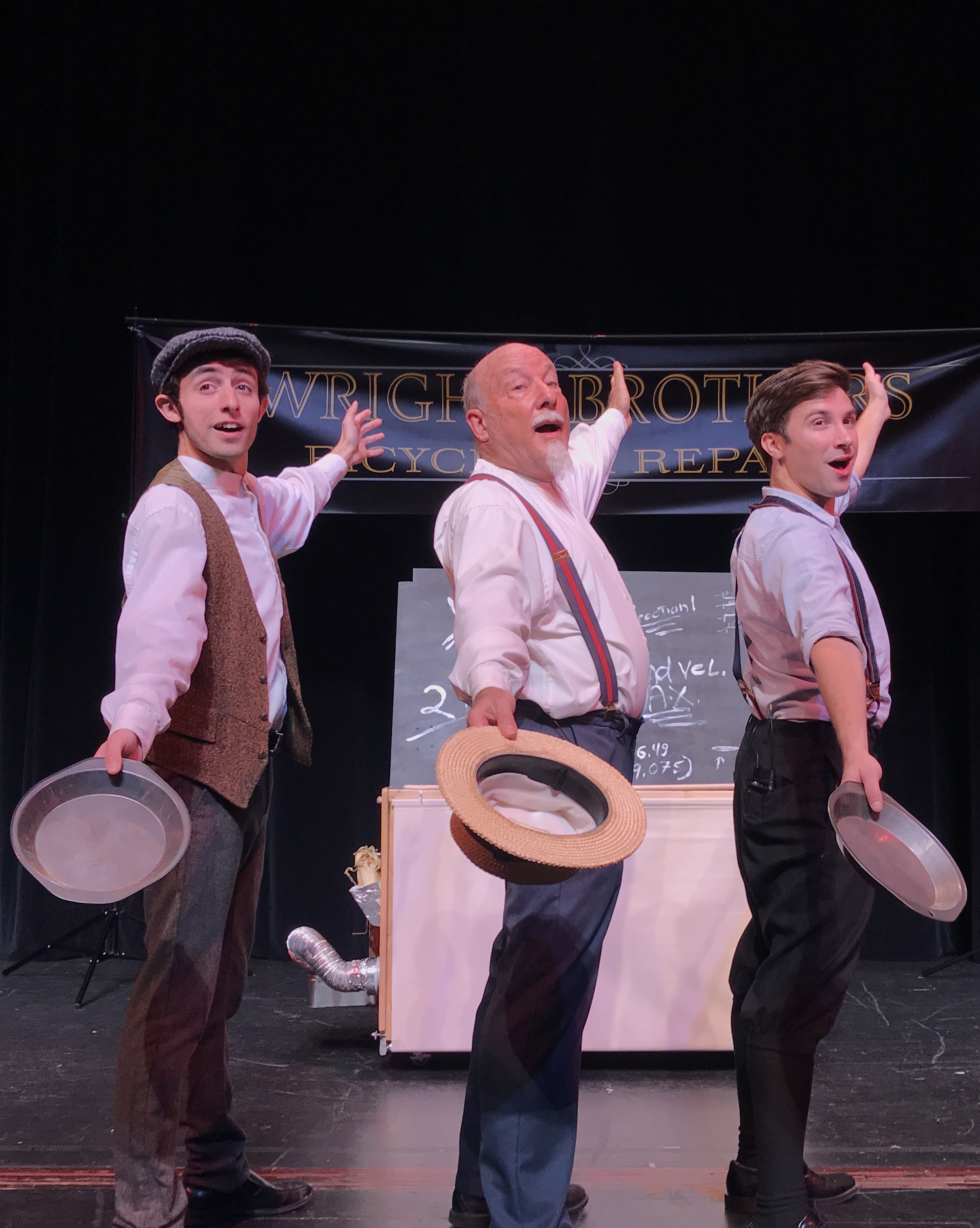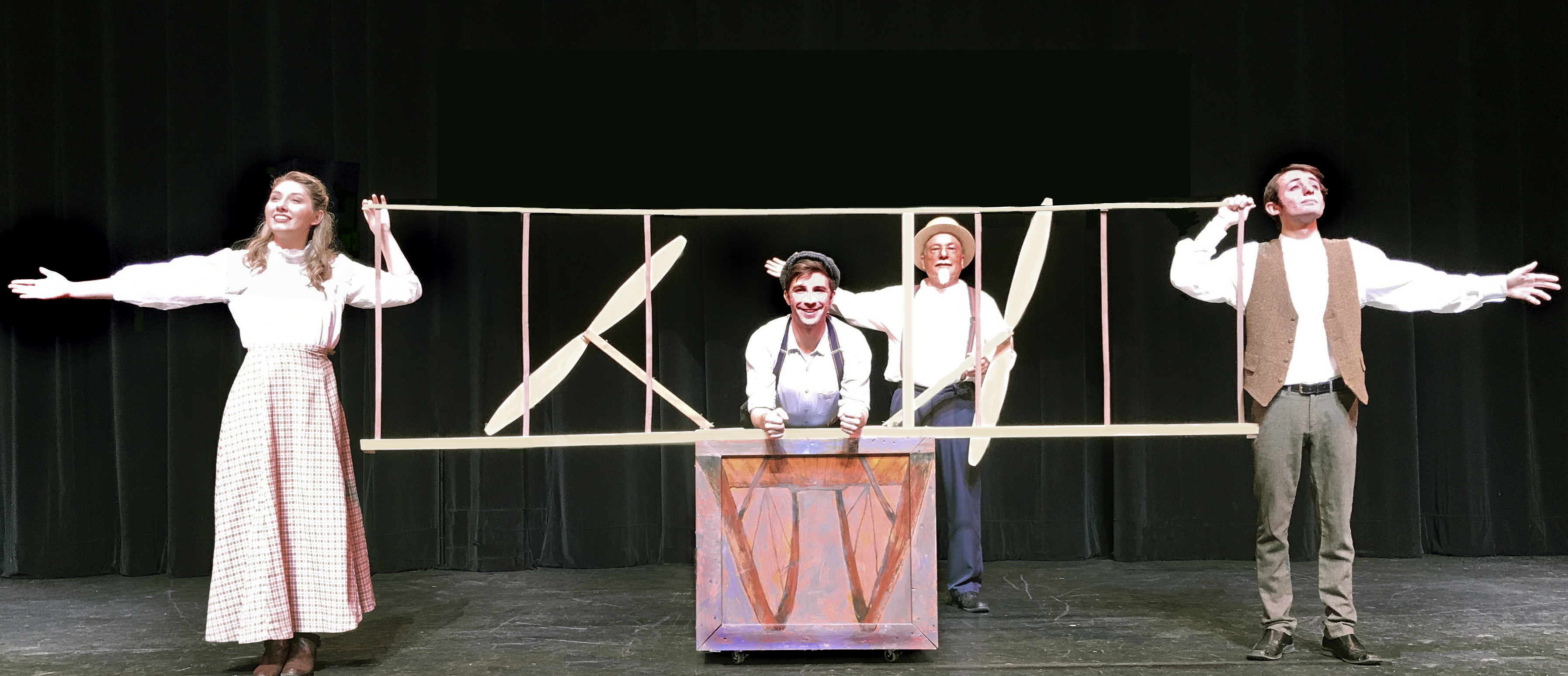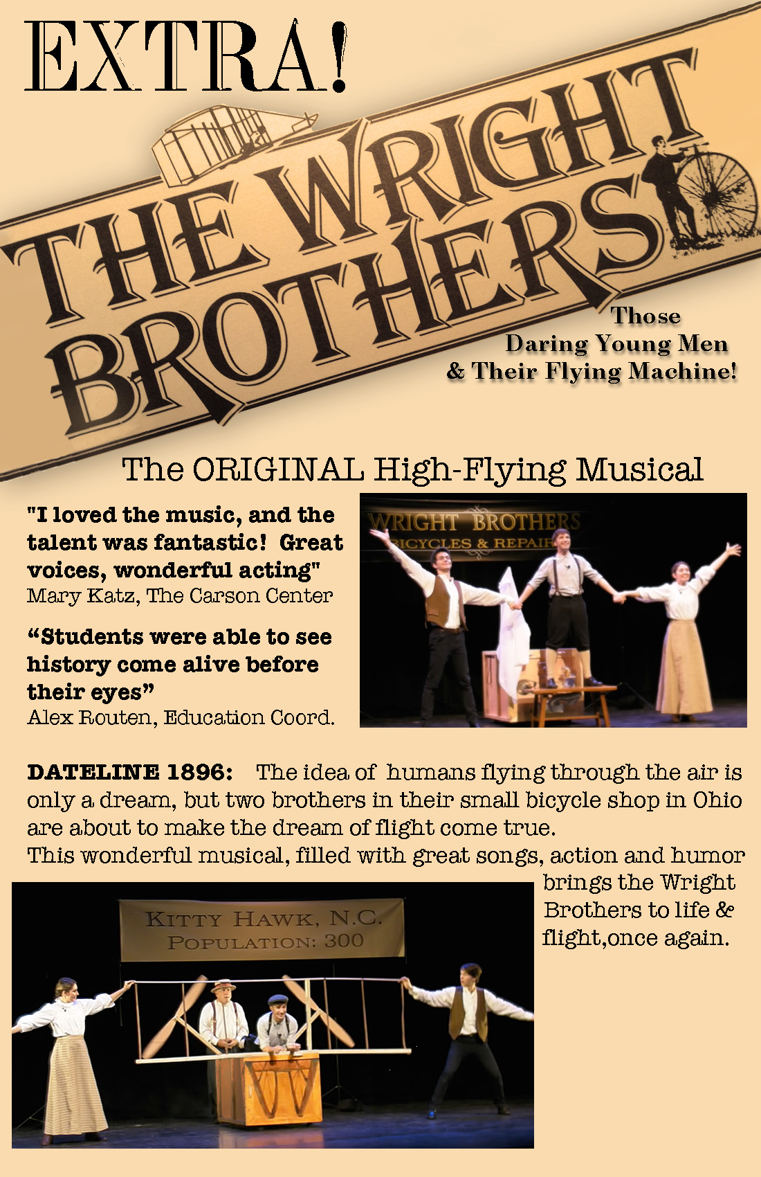 BOOKING INFORMATION: (Those Daring Young Men & Their Flying Machine!) A true "STEM" show - portraying one of America's earliest successes in combining Science, Technology, Engineering and Mathematics. * A highly engaging musical story with great songs and top notch performers. * Recommended for 2nd grade and up as well as family audiences of all ages. (Seniors love it too!) * Running Time is one hour (can be adjusted) * Themes and take-away messages of THE WRIGHT BROTHERS: - Encourages perseverance - never giving up on your dreams. - The value of out-of-the-box, inventive thinking. - Teamwork, brotherhood and loyalty. * Extensive Study Guide (both teacher and student edition) linking the history and science to the story, is available on the Wright Brothers page at www.freshbrewedproductions.com. * Original cast recordings of the entire score are available to share with schools and family audiences to help promote the show. * Marketing/Funding tie-in opportunities with local airports, museums, USAF, and other organizations. (We're happy to brainstorm with you) * Cast is able to offer workshops on History of Flight, Theatre, Music & Composition, etc. Contact us about customizing a workshop for you. * Participation before, during and after the show can be facilitated by including activities, contests and post-show, onstage interactive presentations. Plot synopsis with songs - Click on song titles to hear each song as it appears in the show Curtain Music The scene opens in 1896 at the Dayton, Ohio bicycle shop of Orville and Wilbur Wright. As usual, instead of fixing bikes they are working on new, unheard of inventions. Another Wright Brother Machine After reading about inventors in Europe working on the development of human flight, they start to think about the possibilities, despite the dangers involved. Their sister Katharine thinks they already spend too much time on crazy inventions and not enough on making the bicycle business a success. Pay Attention To Me Wilbur then shares with her his most secret dream of being able to bring the possibility of a flying machine into reality. The dream of flying. Flying Meanwhile, their cranky neighbor, Mrs. Weatherby, comes by to pick up the bicycle she left for repair months before. Orville is a little intimidated by her and tries to make up every excuse possible with no success. Mrs. Weatherby Katherine, pondering how women in her era are regarded, begins to understand that even though her brothers are brilliant, they absolutely need her help and sharp intellect to get organized and succeed. Katherine's Retort The three of them decide that it is indeed their destiny to make this dream real and Wilbur and Orville begin in earnest to build a machine that can fly. Starting with gliders they take their dreams and equipment to Kitty Hawk, North Carolina. After some success, but a lot more failure, they return to Dayton feeling despondent and at the end of their road. Fortunately, a respected French/American scientist and friend, Octave Chanute steps in to lift their spirits. Back To The Drawing Board Back in North Carolina they are finally ready for their historic, first flight. Who will win the coin toss to be the very first human to experience sustained, powered flight? Find out the answer, and witness the historic flight itself in this Wright Brothers musical guaranteed to send your imagination soaring!